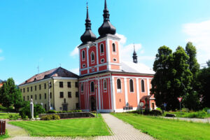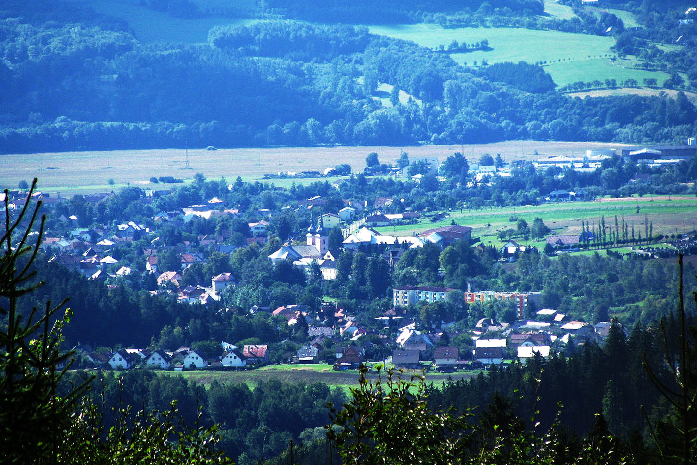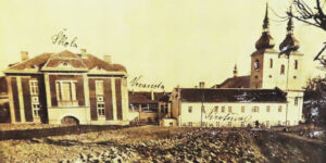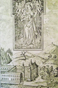 Obrázek zaznamenává kostel a klášter po dostavbě. Vpravo je původní dřevěný kostelík. Na obzoru kříž na Radhošti.