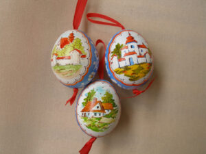 Kromě ornamentálního zdobení to je třeba také krajinka, nebo zátiší s tradiční chaloupkou.