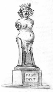Pravděpodobnější je verze od Antonína Tkaného který ve své Mythologii prastarých Němců a Slavanů vykládá, že totiž Moravanům Slunce, Vendičanům ale i jiným Slavanům nejvyššího Boha a životodárce a dobrého rádce vyznamenával. A v tom tedy smyslu byl s Řekův Zevsem a Latiníkův Joviášem Ammonským docela stejný, což také zobrazil můj otec, nebožtík František Gallaš, když roku 1753 kostelní ozdoby na faře Rožnovské řezbal, v jednom prastarém latinském spisu, jež se v rukou tamšího bývalého kaplana P. Povolného vynacházel, a sice v následujícím způsobu: „Hlava muže mladého kadeřavá, korunou špičatou přikrytá; po stranách beraní rohy a velké odstrčené telecí uši mající. Tvář byla důstojná, spolu pak přívětivá. bradou kadeřavou obrostlá. Ostatně byla ta modla bez rukou a bez noh na způsob Hermy Korinstské z mědi ulitá a tak náramně veliká, že v ní hodný muž pohodlně seděti a co se před ním děje, viděti a slyšeti mohl, ano i prostředkem jistého nástroje tázajícím se ho odpovědi vydávati mohl.“