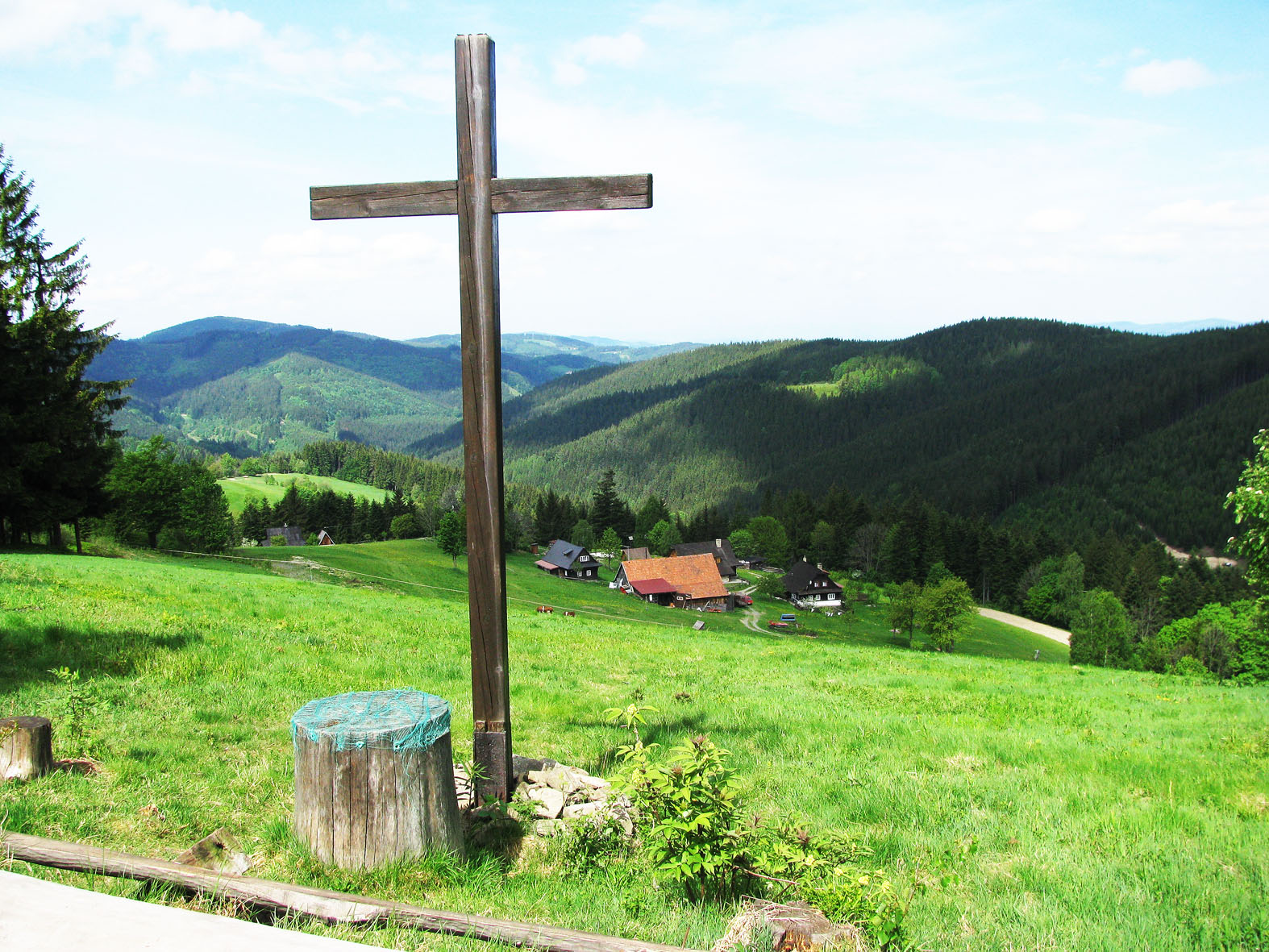 V místě zvaném Jezerné se naskytne neobyčejný výhled na shluk stavení, střežených masivním dřevěným křížem.